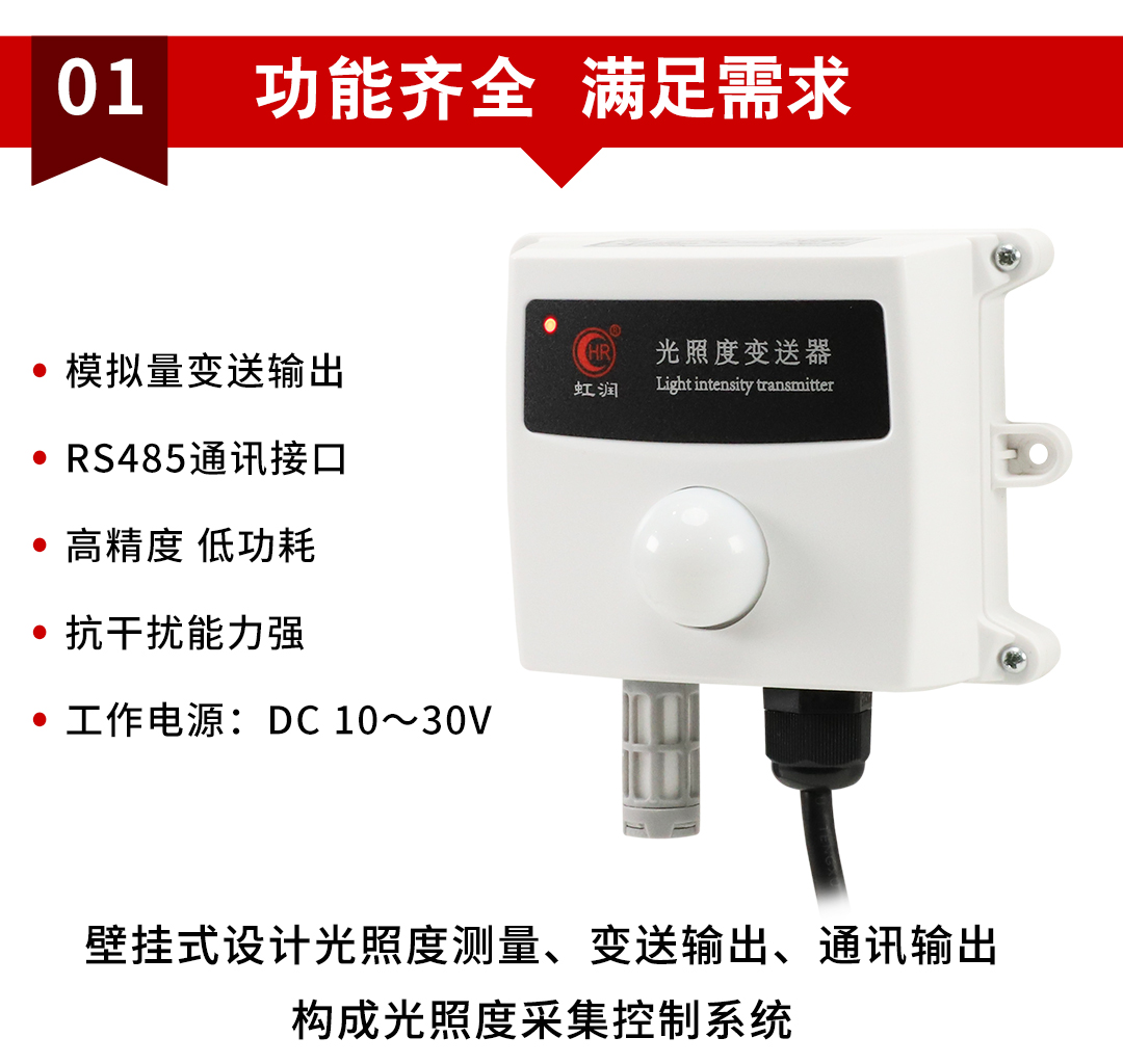 虹潤公司是專業(yè)生產(chǎn)環(huán)境監(jiān)測儀表的國家專精特新“小巨人”企業(yè)。生產(chǎn)的光照度變送器,具有高精度感光傳感器,響應(yīng)靈敏,準確度高,低功耗,模擬量變送輸出或RS485通訊等特點。產(chǎn)品獲得一種農(nóng)業(yè)監(jiān)控變送器、一種儀表電源等2項實用新型專利,主持起草現(xiàn)場設(shè)備集成等5項智能制造國家標準,以及現(xiàn)場設(shè)備工具(FDT)接口規(guī)范、物聯(lián)網(wǎng)總體技術(shù)智能傳感器特性與分類等2項國家標準,參與國際5G標準制定,取得農(nóng)業(yè)監(jiān)測變送器等3項相關(guān)軟件著作權(quán)。產(chǎn)品廣泛應(yīng)用于溫室大棚、花卉養(yǎng)殖、科研實驗、智能樓宇、戶外照明等環(huán)境場合對光照度的檢測。