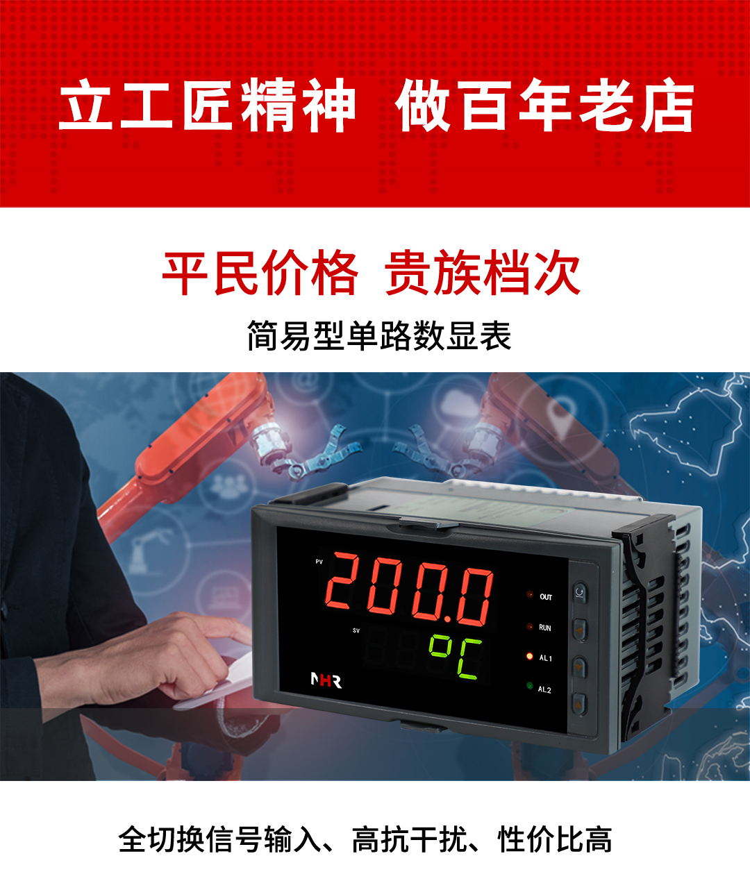 虹潤公司是專業(yè)生產(chǎn)數(shù)顯表的國家專精特新“小巨人”企業(yè),生產(chǎn)的簡易型數(shù)字顯示控制儀,具有全切換信號輸入,多種外形尺寸,高抗干擾,輸入/輸出/電源三隔離,性價比高等特點。該產(chǎn)品不僅通過德國萊茵 CE 認證,還獲得巡回檢測顯示方法及裝置、儀表殼體等2項國家發(fā)明專利,主持起草工業(yè)過程控制系統(tǒng)用模擬輸入兩位或多位輸出儀表、物聯(lián)網(wǎng)智能溫度儀表通用技術條件等2項國家標準,以及通信系統(tǒng)多通道數(shù)據(jù)采集控制終端規(guī)范軍用標準,參與國際5G標準制定,取得簡易數(shù)顯儀表等3項相關軟件著作權。產(chǎn)品廣泛應用于電力、石化、冶金、化工、造紙、食品、輕工、制藥、熱處理、水處理、機械配套等各種工業(yè)現(xiàn)場。