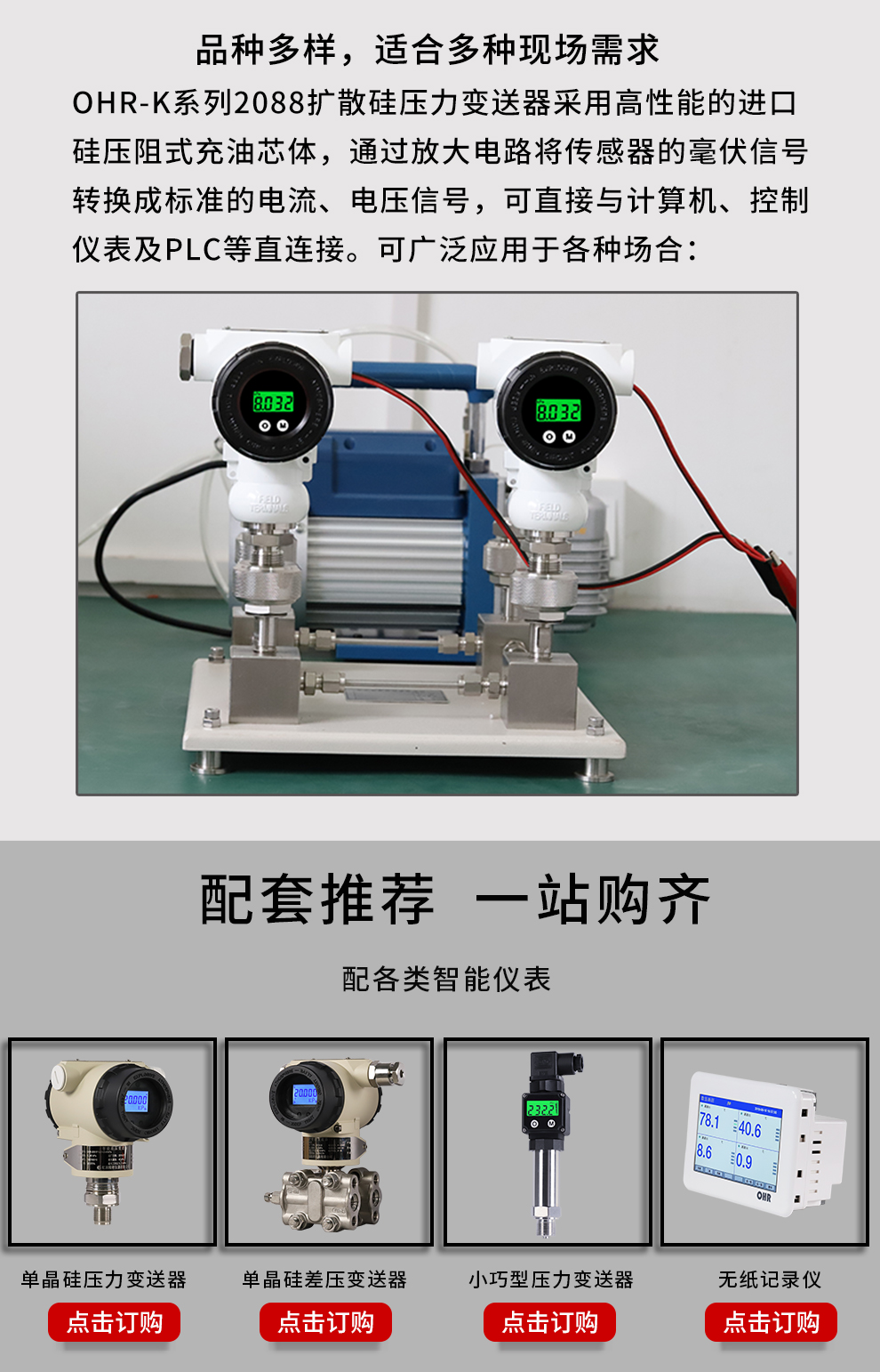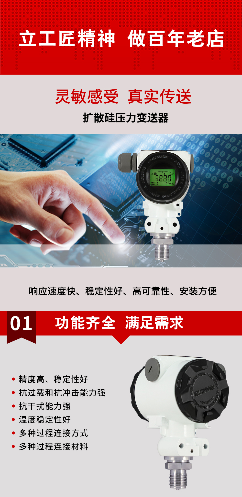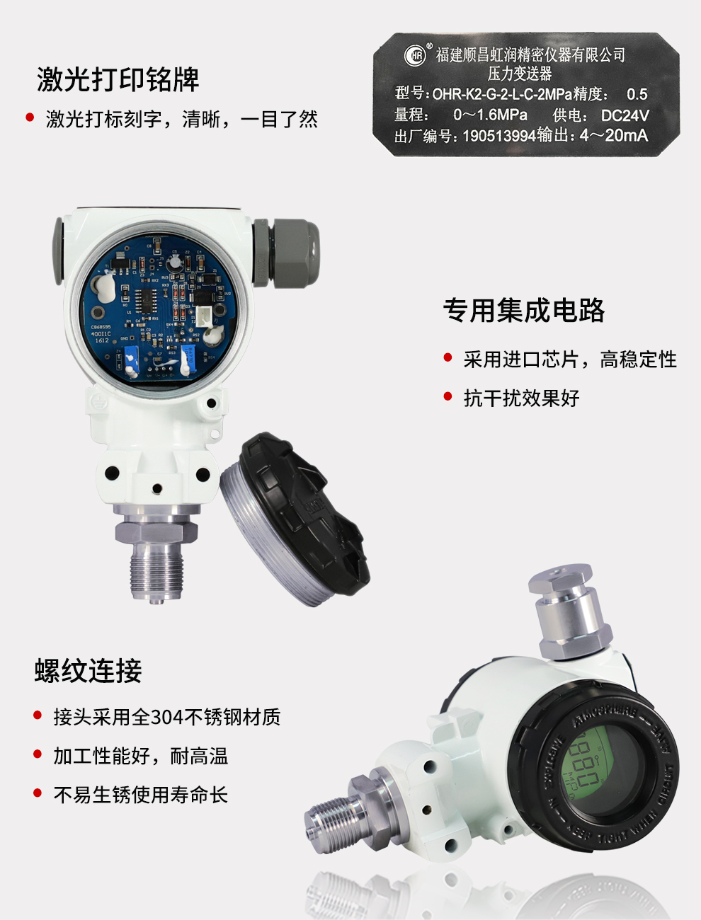 虹潤公司是專業(yè)生產壓力變送器的國家專精特新“小巨人”企業(yè),生產的擴散硅壓力變送器,具有精度高,穩(wěn)定性好,響應速度快,高可靠性,抗過載和抗沖擊能力強,安裝方便等特點。產品獲得一種數字顯示低功耗壓力表、一種信號發(fā)生器裝置等2項國家發(fā)明專利,主持起草工業(yè)過程控制系統用模擬輸入兩位或多位輸出儀表、工業(yè)過程測量和控制系統用壓力/差壓變送器等2項國家標準,通信系統多通道數據采集控制終端規(guī)范軍用標準,以及現場設備集成等5項智能制造國家標準。參與國際5G標準制定,取得數顯壓力表等2項相關軟件著作權。產品廣泛應用于化工、食品、制藥、電力、設備配套、供暖、水處理、樓宇等行業(yè),需精準測量流體壓力的現場。
