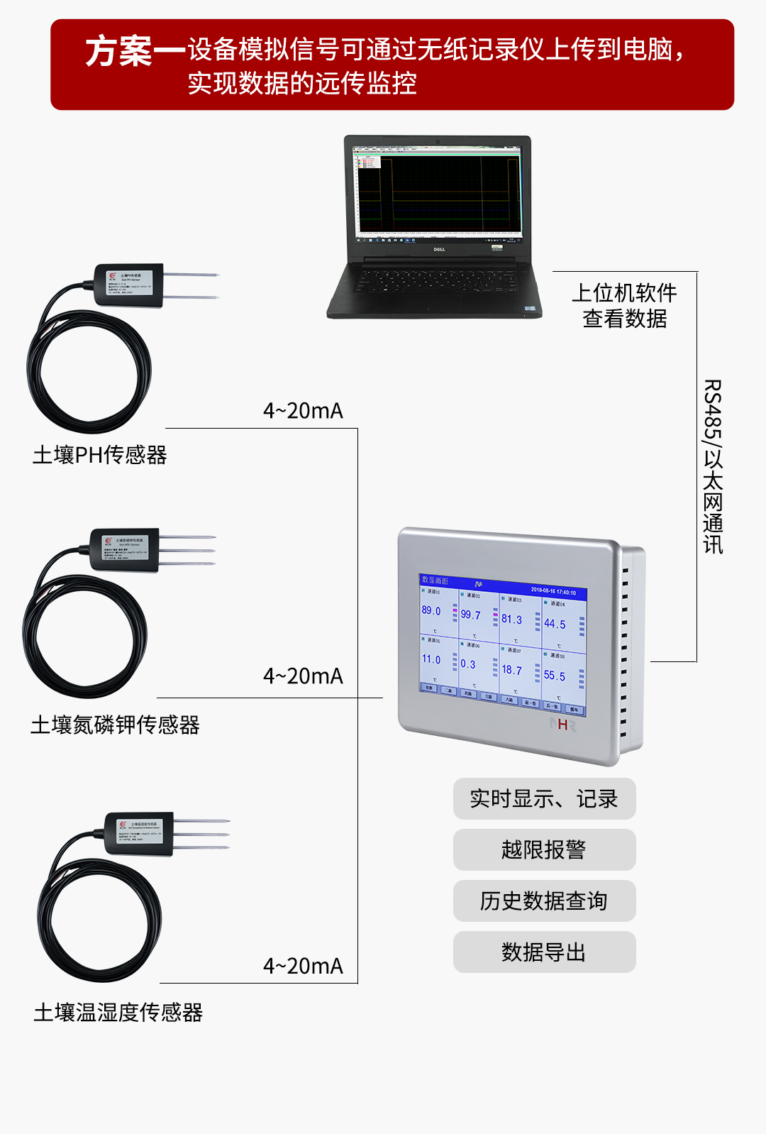 | 環(huán)境監(jiān)測儀 | 大屏溫濕度記錄儀 溫濕度儀表 環(huán)境參數(shù)變送器 直插式土壤傳感器 |